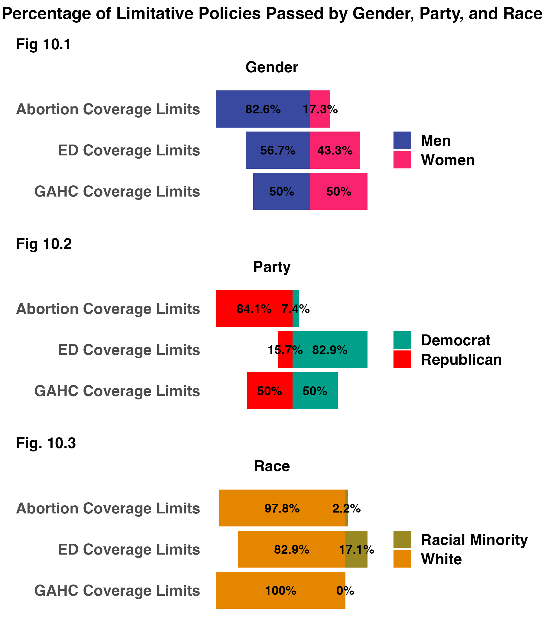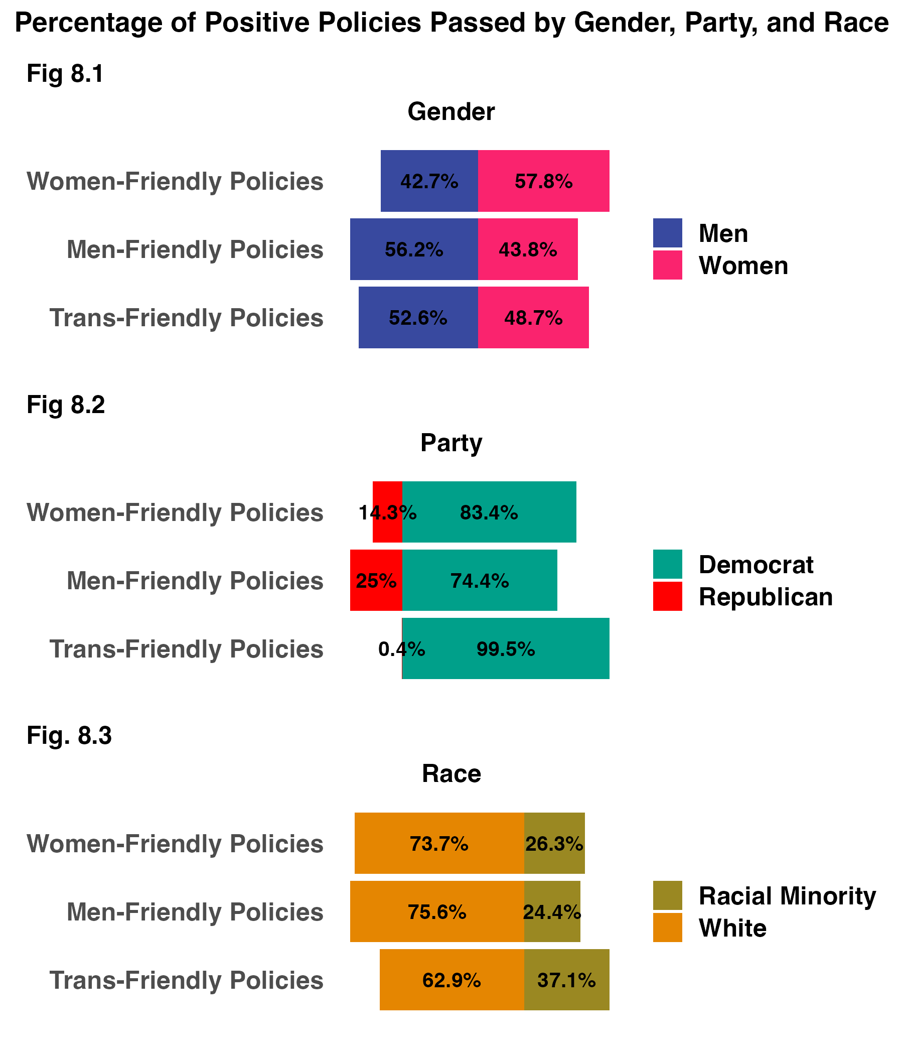 As a supplementary extension of this project, we constructed an additional dataset on the demographics of bill cosponsors for the policies in our main dataset. This includes counts by gender, party, and race for legislators supporting each policy. While not part of the primary analysis, these data provide suggestive evidence on who is supporting and advancing gender-related healthcare policies, offering insight into potential mechanisms underlying our main findings. The bar plots below were made through this data.