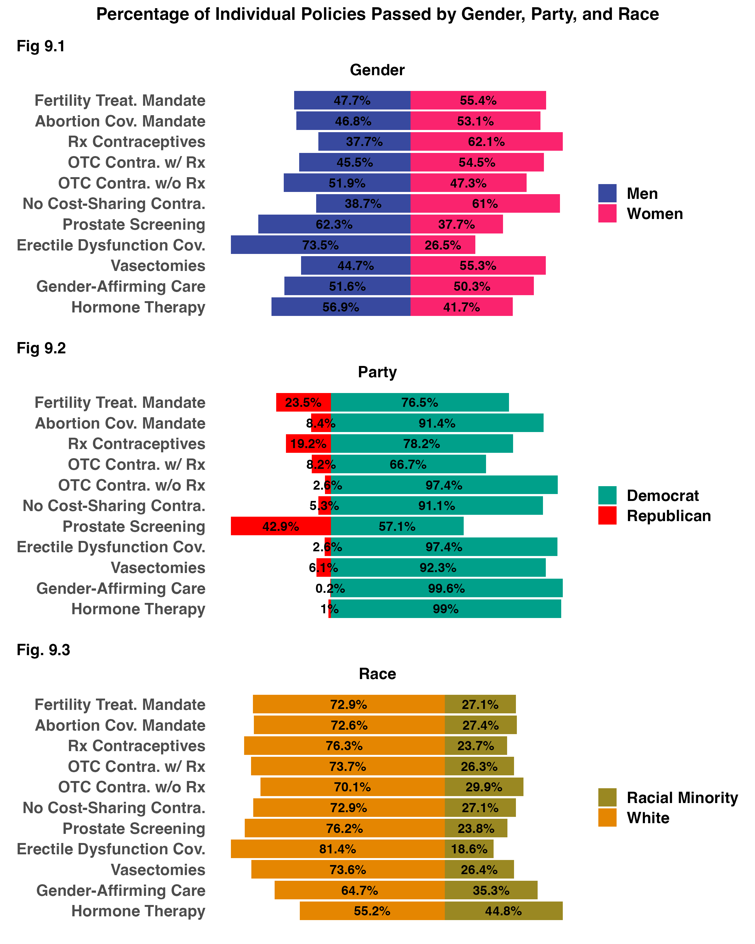 We find that increases in women’s representation are associated with a higher likelihood of enacting women’s health-related policies. The effects are smaller for men’s healthcare policies. We observe a similar positive relationship for transgender healthcare policies, suggesting that women legislators play a broader role in advancing gender-related healthcare policy.
