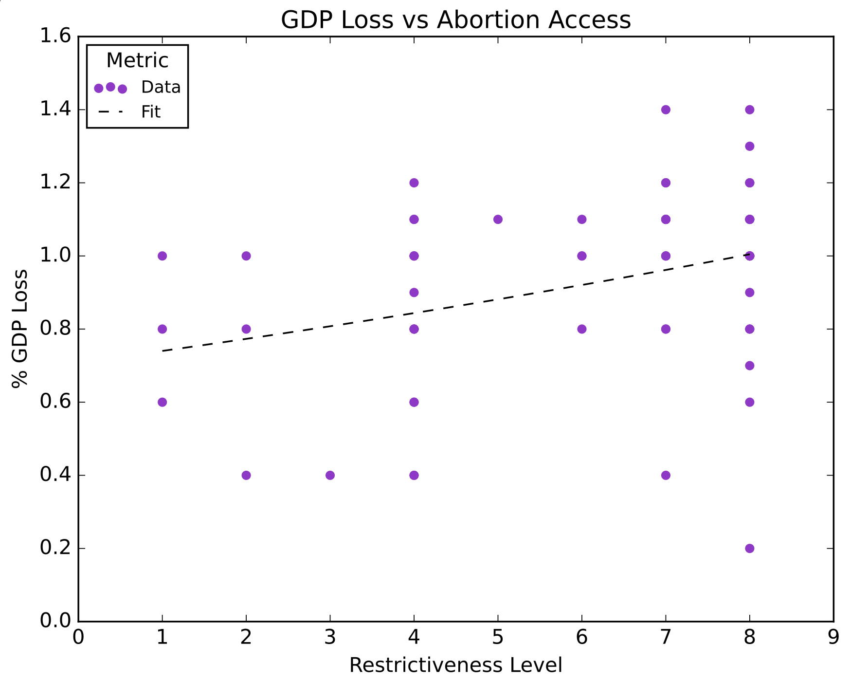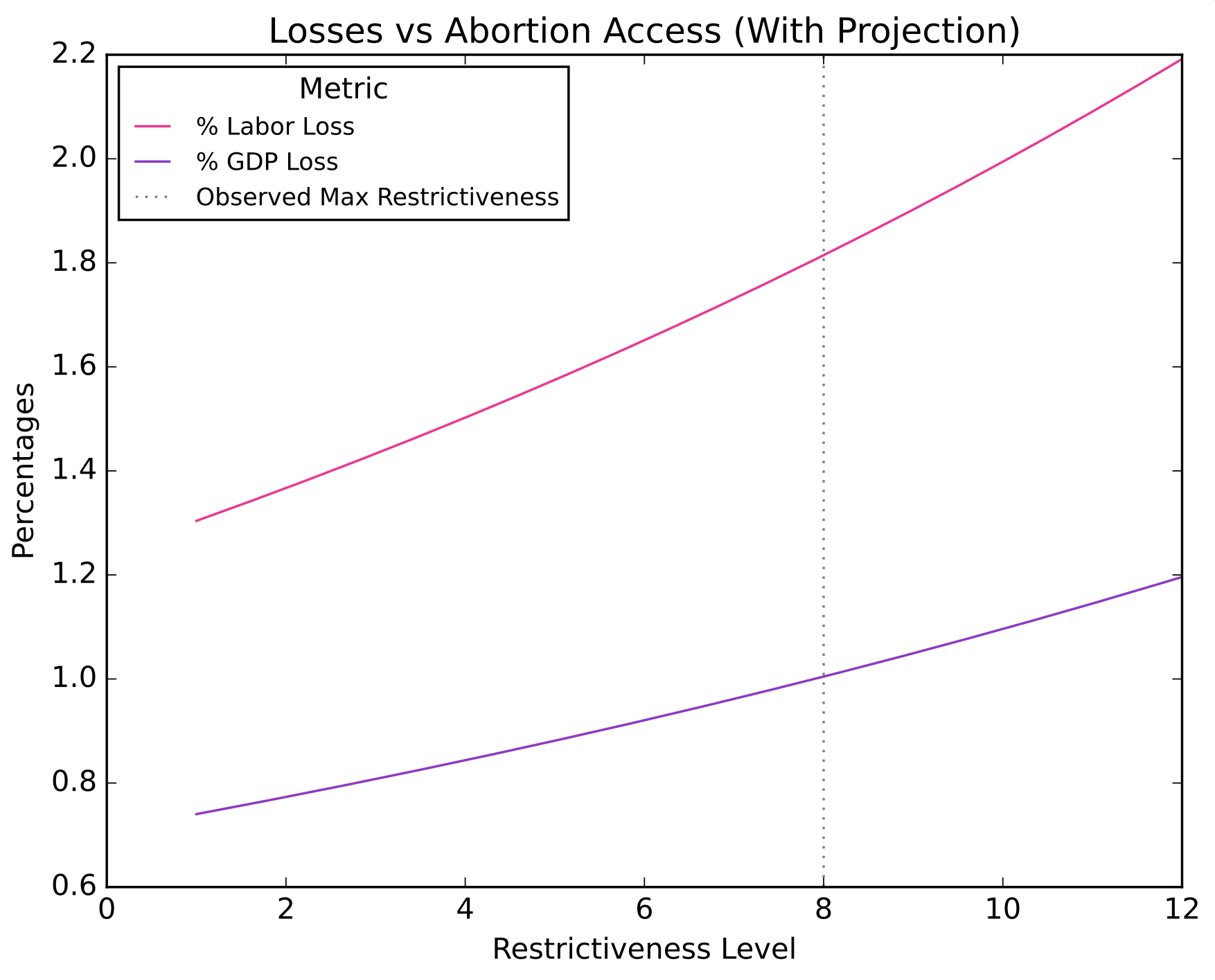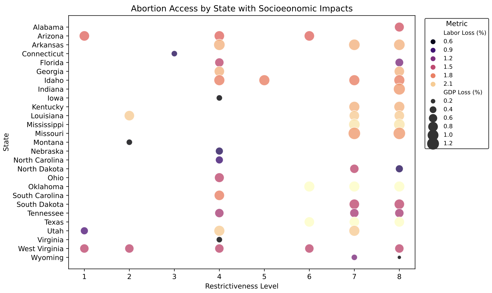 I imported the datasets into Jupyter Notebook and merged them. I then modeled the relationship between abortion restrictiveness and economic outcomes using best-fit exponential models for GDP and labor force loss. I also created projected models beyond the highest observed restrictiveness level (level 8), considering potential scenarios such as total abortion bans combined with other state-level restrictions, including limits on travel for abortion access. The data includes observations from 2022 - 2024.