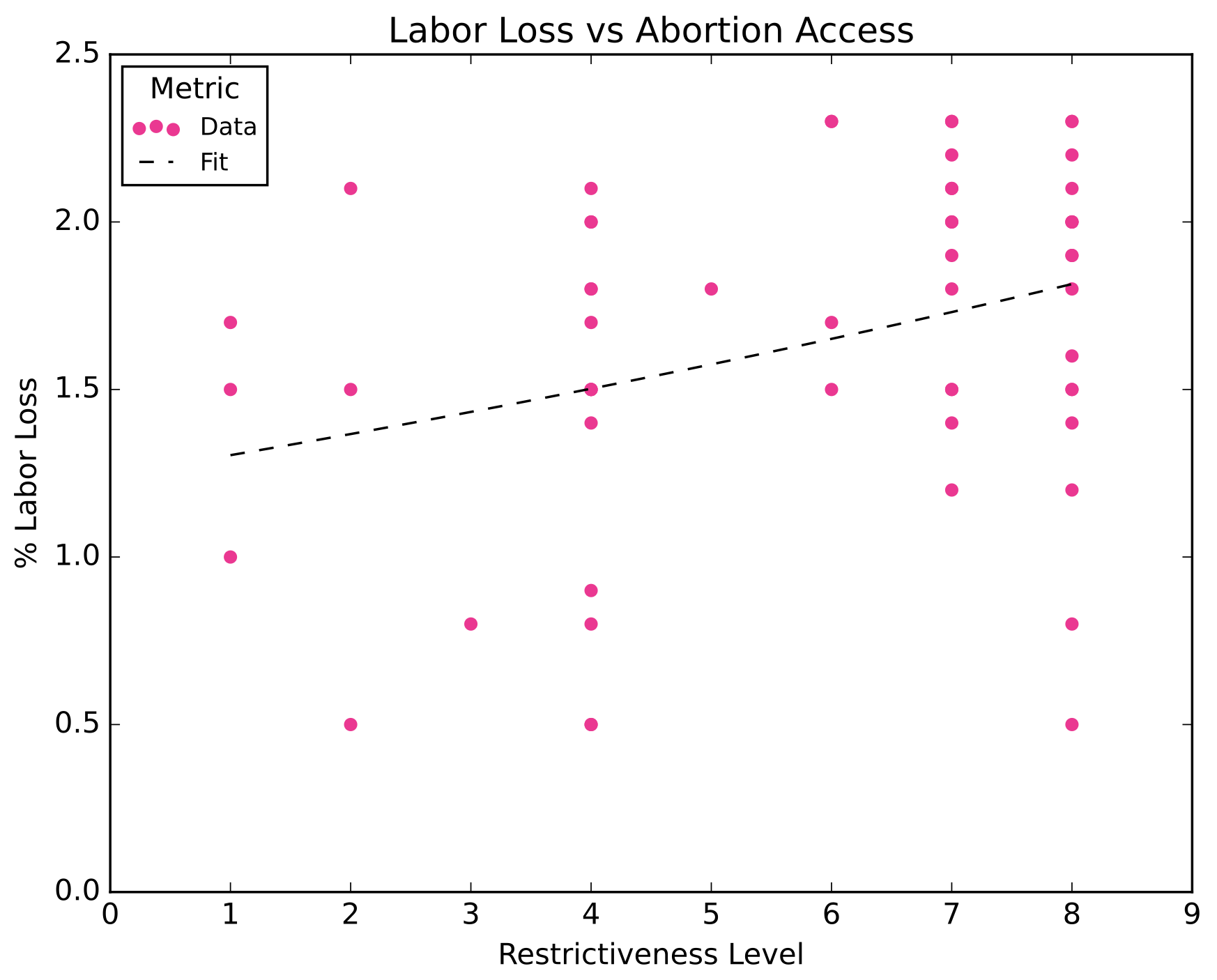 - Around 10.5% of the variation in labor force loss across states is explained by the restrictiveness of abortion laws.